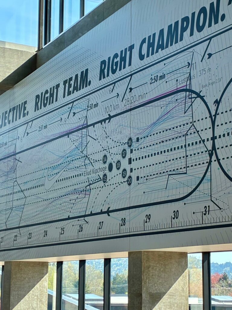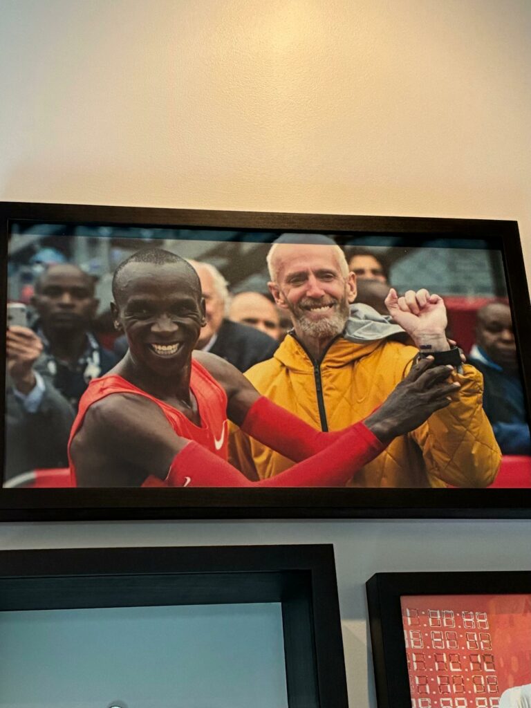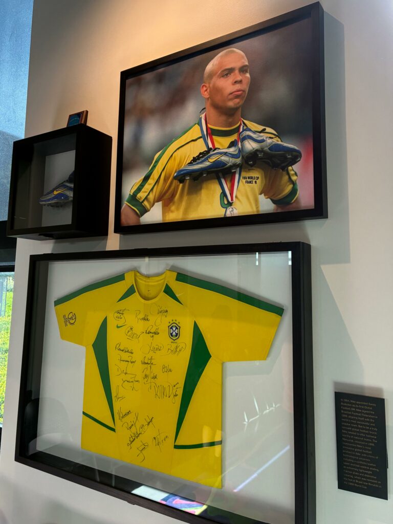 Il est maintenant l’heure de pénétrer dans le building, sous haute surveillance. On dépose nos affaires dans une salle, au mur, photos d’Eliud lors de Breaking 2 et de Ronaldo, le Brésilien, le vrai, et rien que ça, ça fait plaisir. Photos interdites, badges obligatoires. On monte tout en haut pour visiter le Nike Sport Research Lab où le Dr. Matt Nurse, VP Chief Science Officer chez Nike, nous accueille pour nous faire visiter les lieux.