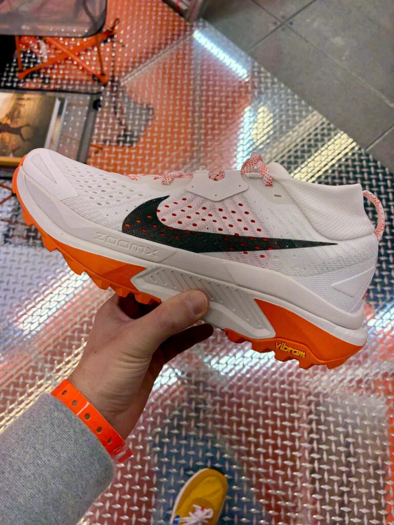 150 m² aux couleurs de la nouvelle DA ACG, avec une sorte de yourte métallique orange dans laquelle nous découvrons la gamme textile et shoes, LDV, Peg ACG Trail, UltraFly 2, nouvelle Zegama et surtout une exclusivité sous embargo, la Zegama Hike, qui conserve le gros amorti de la Zegama avec plus de protection, une semelle plus durable et une plateforme encore plus large et stable.