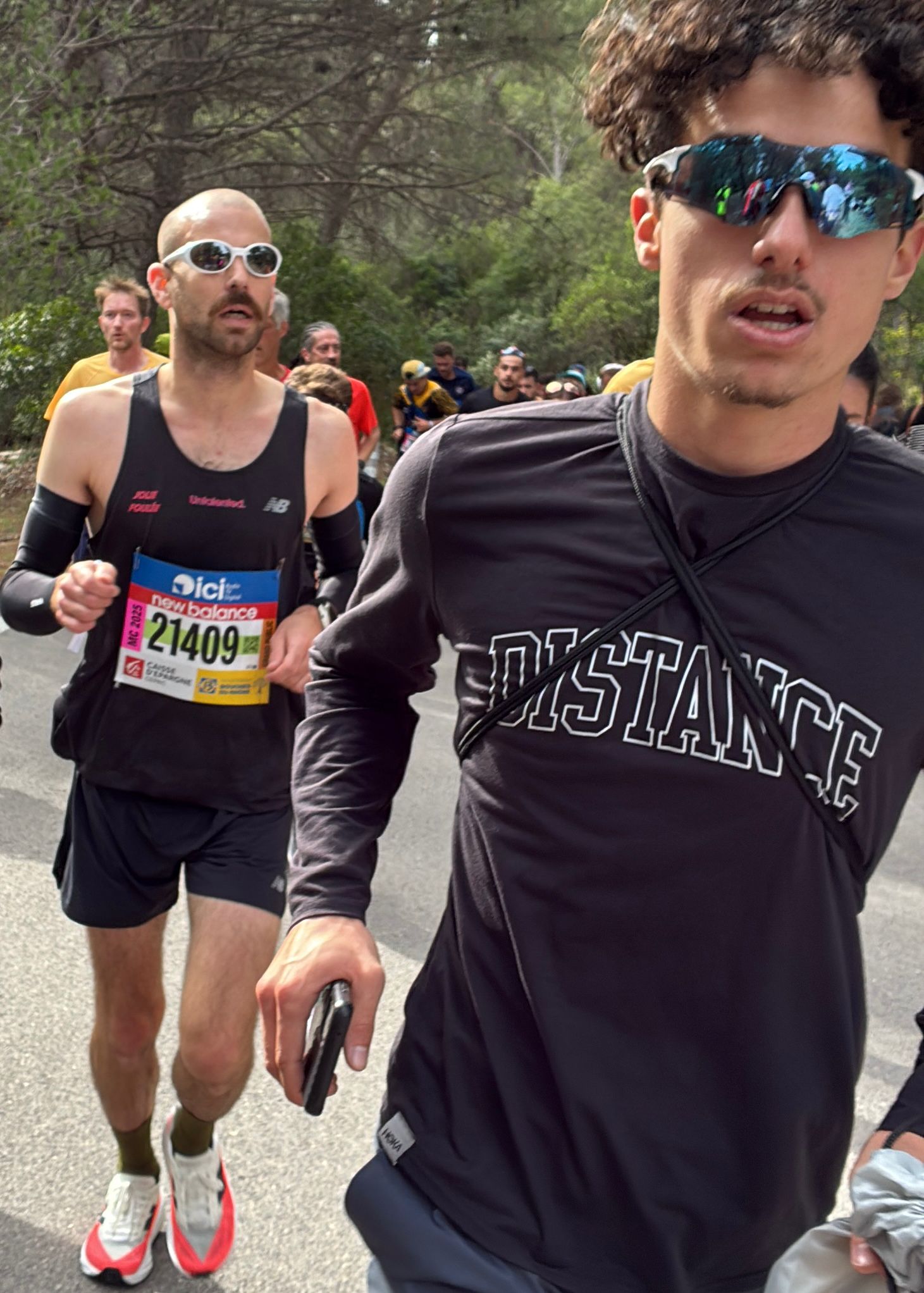 Que dire de la perf de notre photographe international en gestion complète, après mon arrivée je me suis rhabillé, fait masser, j’ai discuté avec des amis, discuté avec des gens que je ne connaissais pas et j’ai appelé Lio pour savoir où ils en étaient. J’ai donc pu les rejoindre vers le 17ème kilomètre, partager les derniers kils de bonheur de notre Seb qui faisait semblant de grimacer pour pas qu’on l’incite à aller plus vite !