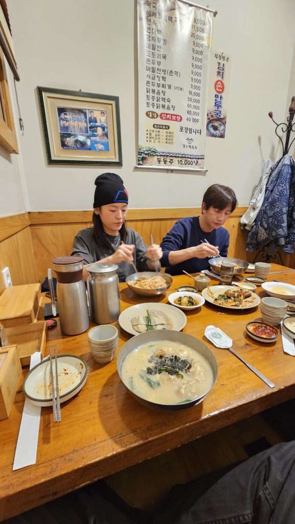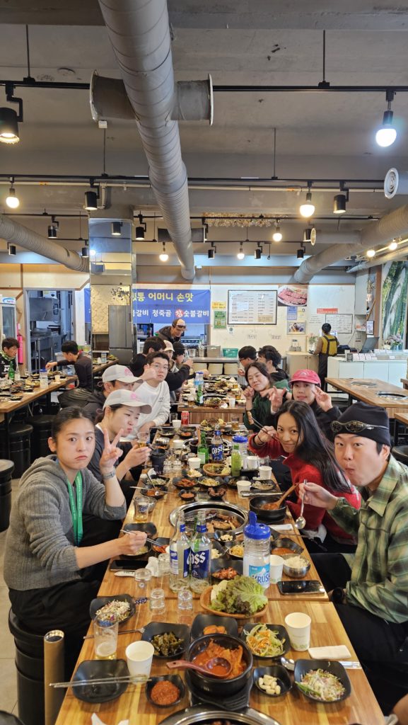 Idris : On en revient à la bouffe : je n’ai pas réussi à faire passer la déception du chrono avec la Choco Pie du kit d’arrivée. Il m’a fallu un bon barbecue partagé avec les membres de Commune de Seoul et de GR pour assumer le fait que je sois untalented. On a fait glisser le repas avec du Somaek (soju + bière) . L’ambiance était vraiment cool.