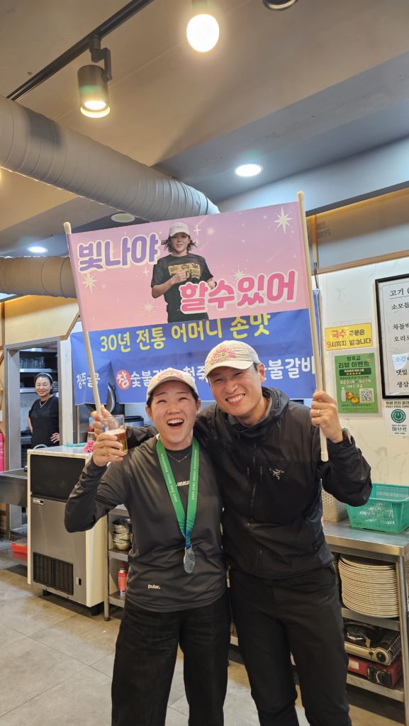 On a vite l’impression d’être dans un objectif commun avec les gens sur le bord de la route. Ils ne vous connaissent pas, mais ils vont tenter de vous aider à finir votre course. Ils viennent avec du matos pour assister un maximum de coureurs : gels anti-crampes, Coca, étirements, bombe de froid pour atténuer une douleur… c’est très coréen de faire passer le groupe avant l’individu et de surmonter les épreuves ensemble.