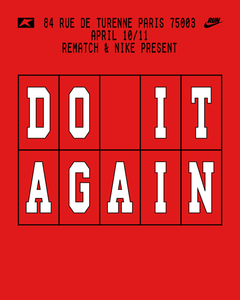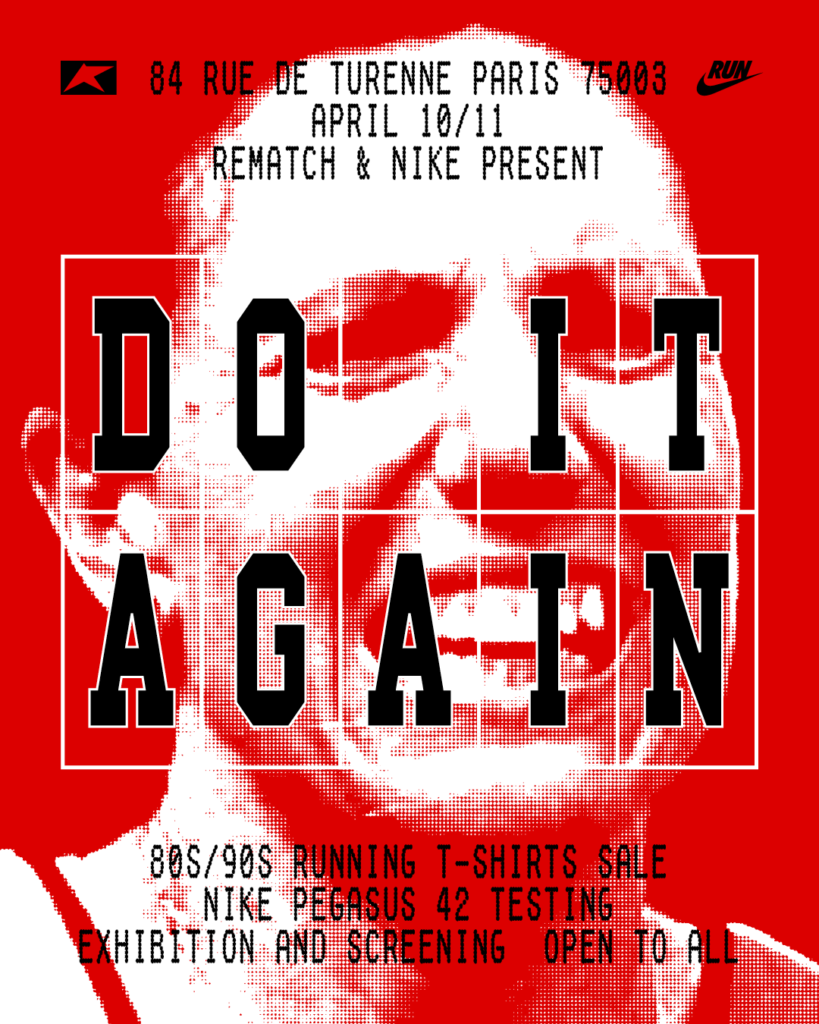 Pour tous ceux qui sont fan comme nous de vieux (et beaux) tee-shirts liés à la course à pied, nos amis de Rematch sont de retour pour le week-end du marathon de Paris. Avec Nike, ils présentent un concept autour de l’obsession du coureur. Ce truc irrationnel qui nous fait retourner courir alors qu’on est déjà sec. Encore une fois, malgré la fatigue, les douleurs, l’accumulation des kilomètres. En boucle.