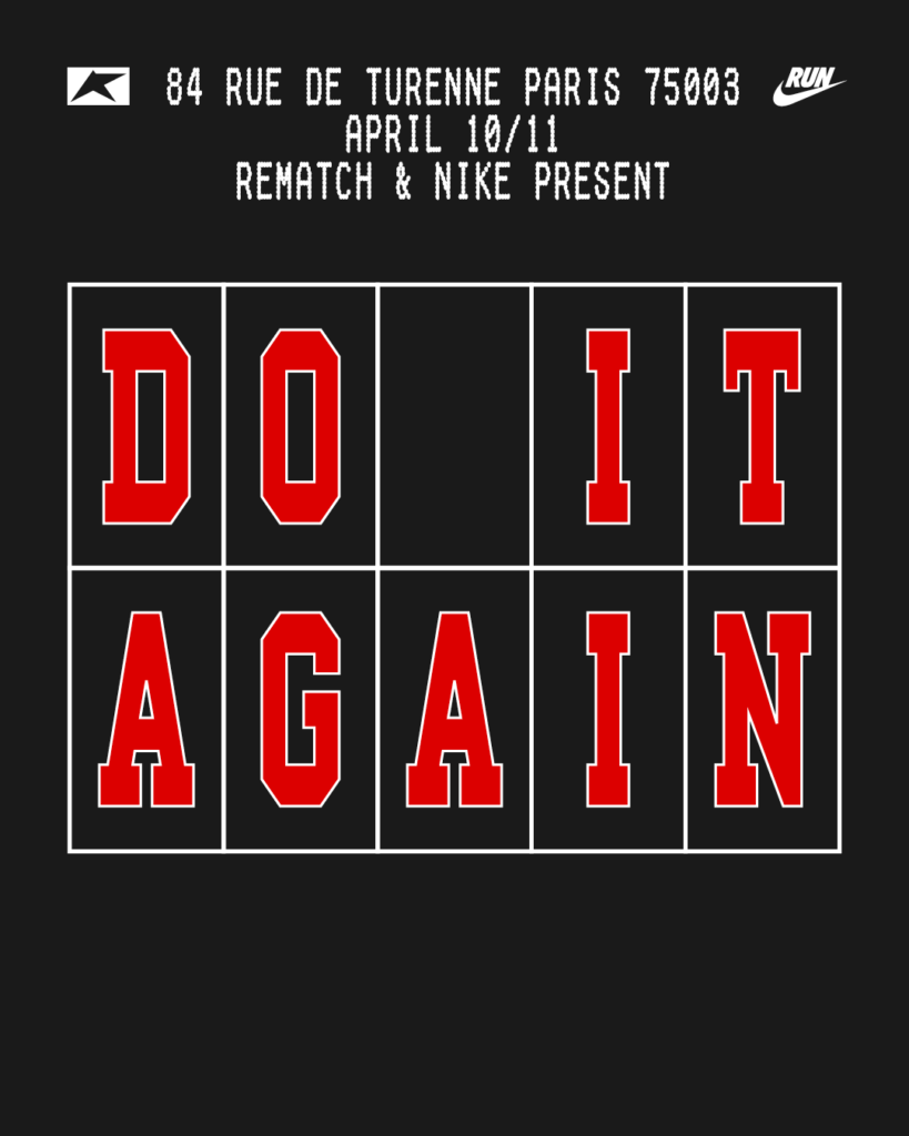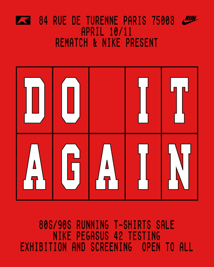 Pour tous ceux qui sont fan comme nous de vieux (et beaux) tee-shirts liés à la course à pied, nos amis de Rematch sont de retour pour le week-end du marathon de Paris. Avec Nike, ils présentent un concept autour de l’obsession du coureur. Ce truc irrationnel qui nous fait retourner courir alors qu’on est déjà sec. Encore une fois, malgré la fatigue, les douleurs, l’accumulation des kilomètres. En boucle.