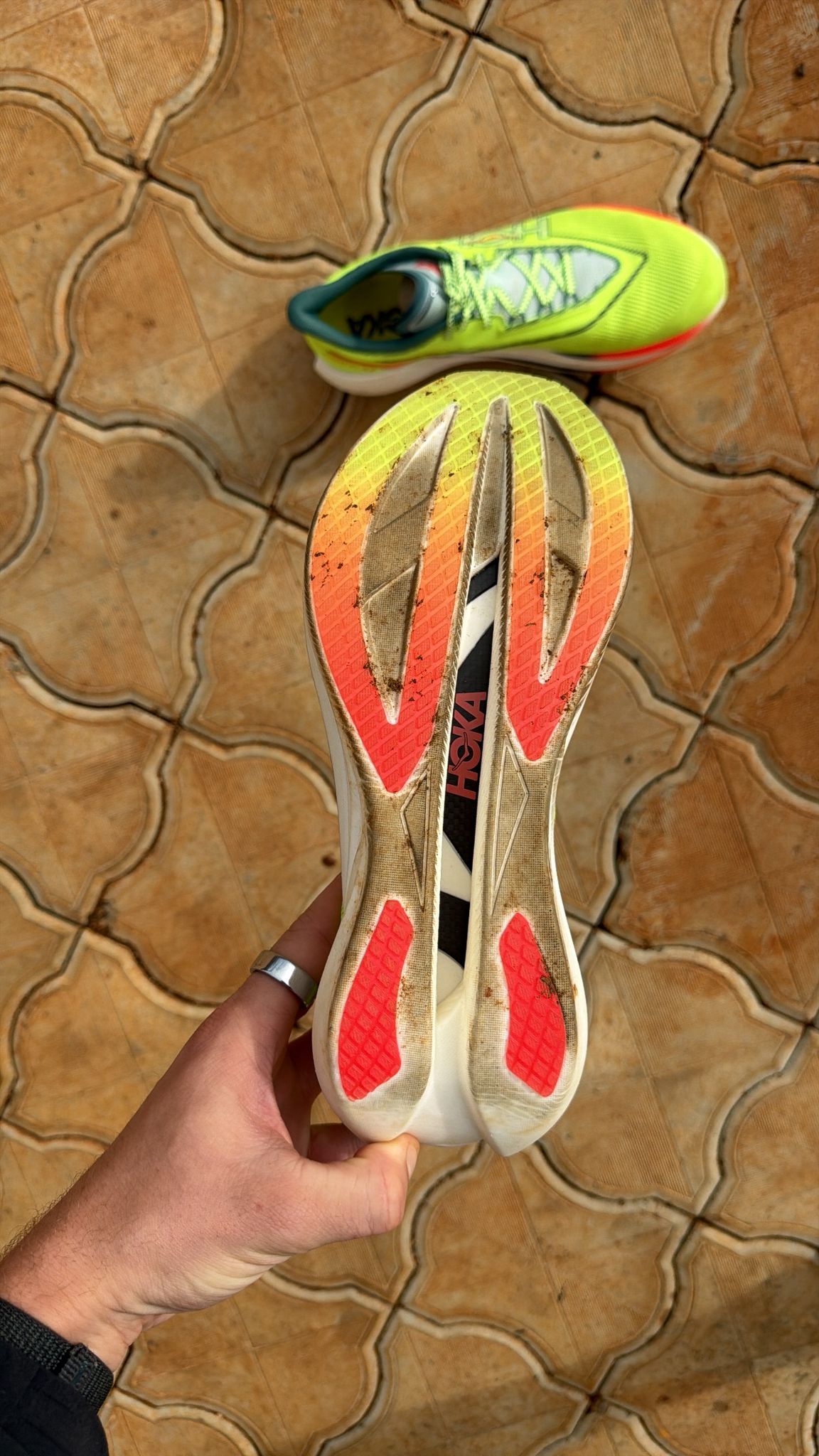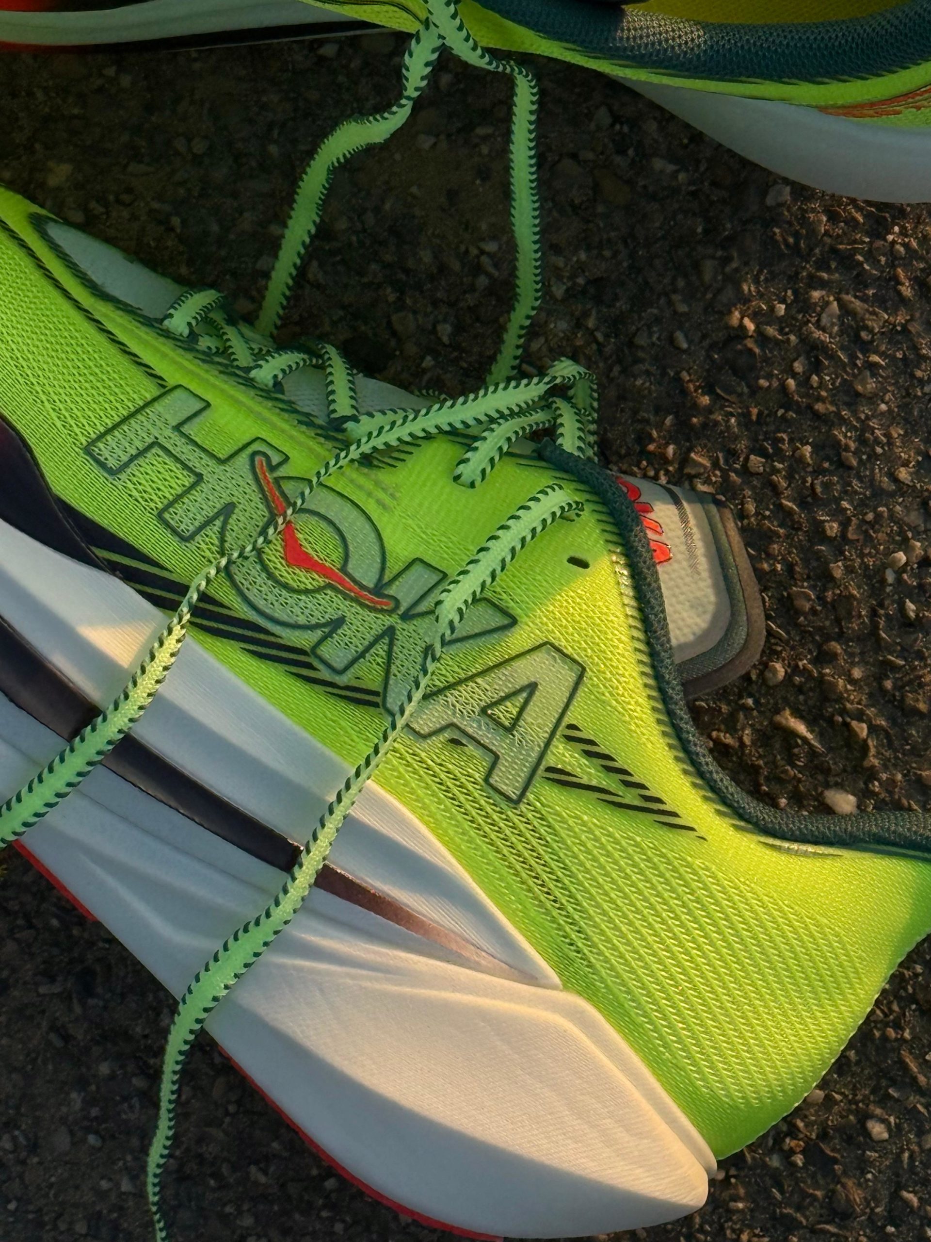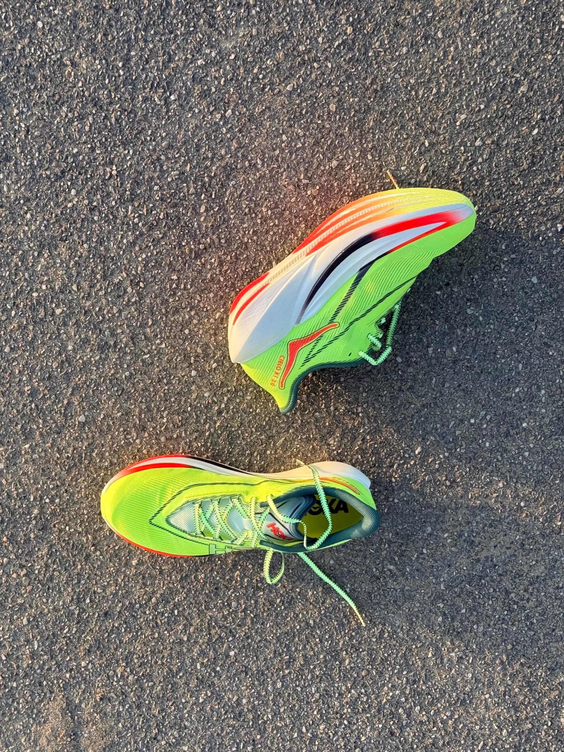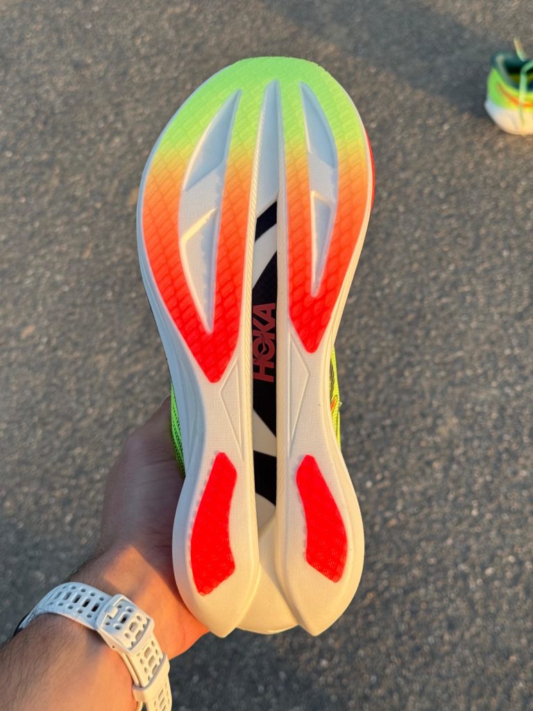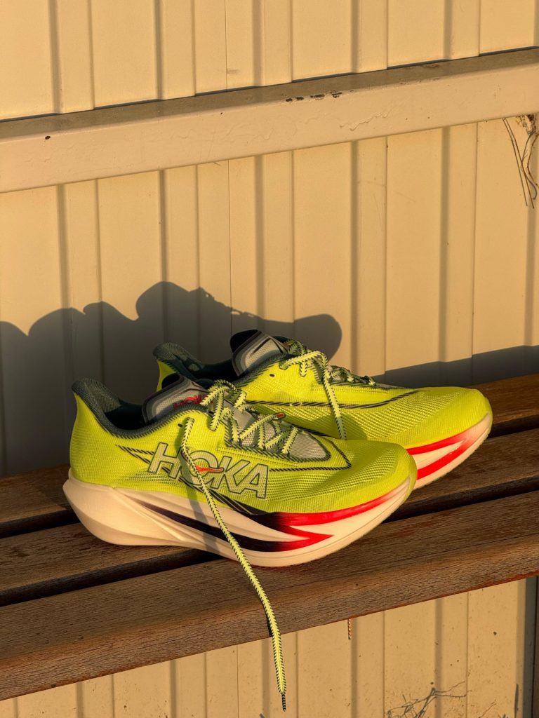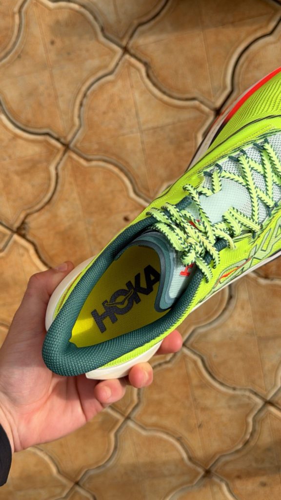 Esthétique : une sorte de Safety Yellow qui mettra parfaitement vos pieds en évidence si vous êtes victime d’une panne sur l’autoroute ou qui permettra à vos supporters de vous voir arriver de loin. Pour le reste on est dans l’agressivité avec une empeigne pointue, un rocker prononcé et des lignes et dessin qui vous mettent tout de suite dans une ambiance course, vitesse, PB ou explosion en vol c’est au choix. Pas une folie de design mais pas dégueu non plus. L’ensemble avec la collection textile Hoka « Race Day » a clairement de la gueule. Si on fait une course de merde, on le fera au moins avec une vraie dégaine.